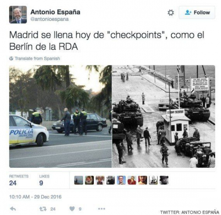 Antonio España ha borrado este tuit en el que comparaba la situación de Madrid con la del Berlín de la RDA y sus famosos 'check points'. Es el punto en el que más cerca hemos estado de cumplir la Ley de Godwin.