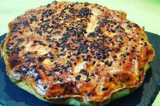 Esta receta es perfecta para aprovechar sobras. Se forra un molde con masa brisa, se agrega el goulash y el queso en trocitos, se tapa con más masa y, por último, se pinta con huevo y se decora con semillas de sésamo.