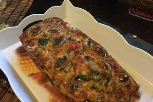 Se puede presentar de esta manera o en moldes pequeños de magdalenas si se quiere servir de manera individual. Lleva pimiento rojo, zanahoria rallada, champiñones y huevos.