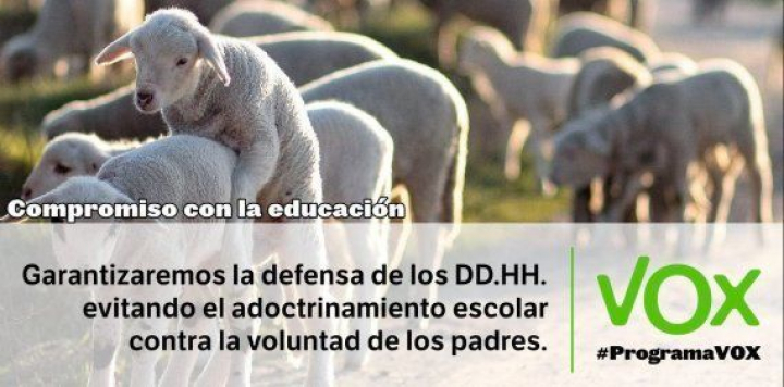 Aunque algunos dudaban hasta de que fuera una imagen oficial, lo cierto es que Vox ha utilizado esta curiosa foto para asegurar que garantizarán la defensa de los Derechos Humanos "evitando el adoctrinamiento escolar contra la voluntad de los padres".