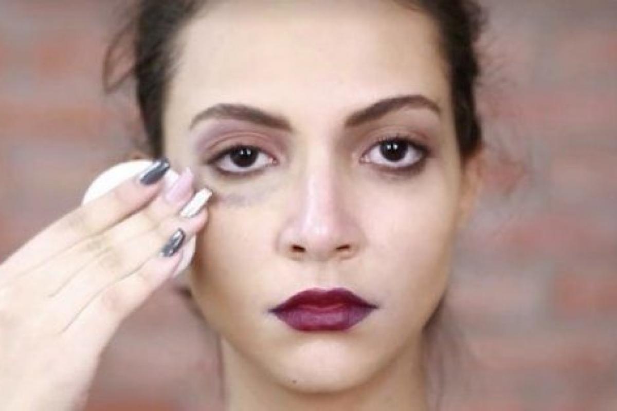 En el tutorial aparece una mujer joven, perfectamente maquillada y sonriente, que se desmaquilla frente a la cámara desvelando poco a poco las muestras de maltrato sobre su rostro.