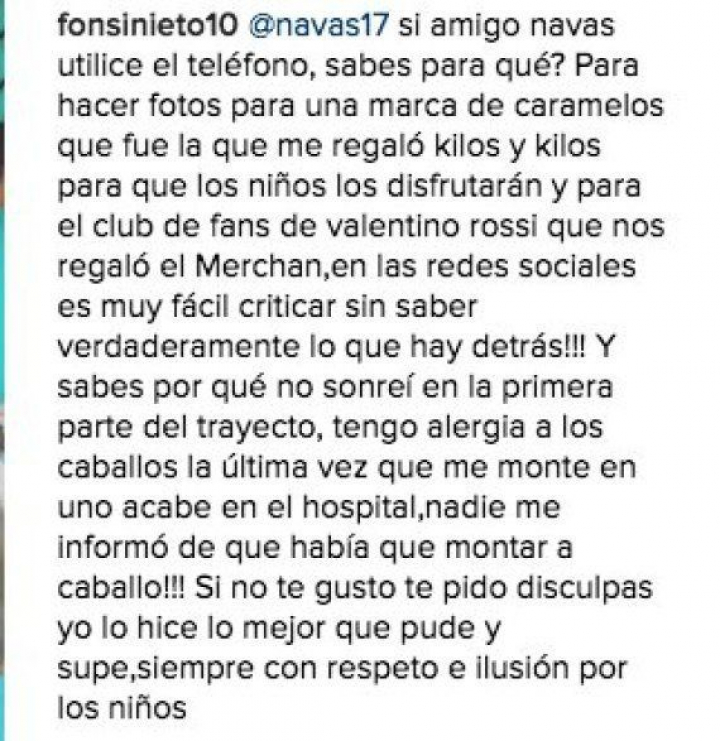 El propio dj y ex piloto de motociclismo ha respondido ante estas afirmaciones. Y ha comentado en esta red que utilizaba el móvil para hacer fotos para una marca de caramelos que había regalado kilos para la cabalgata y también para el club de fans de Valentino Rossi, que había ayudado en la misma. Asimismo, aclara que no sonrió en la primera parte porque tiene alergia a los caballos y no sabía que tenía que montar en uno.