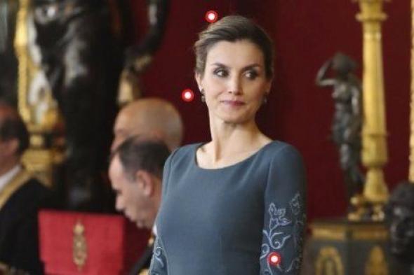 La reina optó por un diseño de Felipe Varela, un vestido azul verdoso ajustado con bordados en las mangas y en los laterales. Doña Letizia lo había estrenado en una Recepción al Cuerpo Diplomático acreditado en España celebrado en el Palacio Real durante el mes de febrero de 2014.