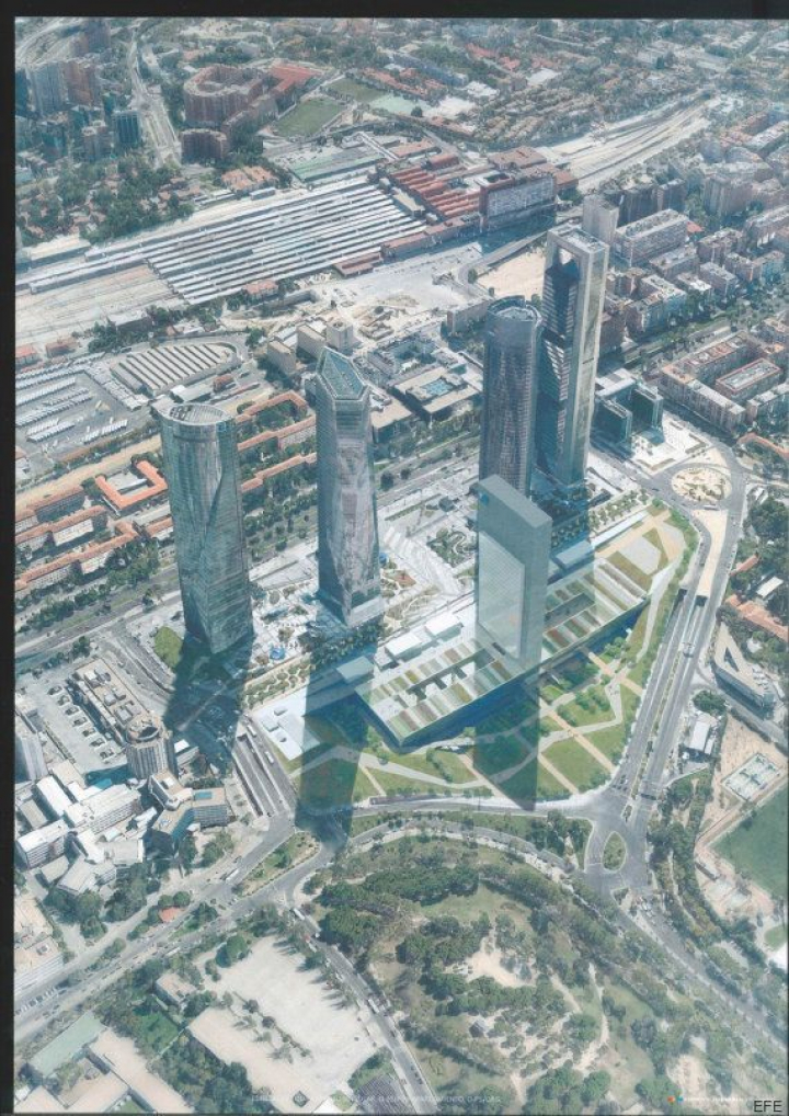 El proyecto, que ha sido presentado por el presidente de Inmobiliaria Espacio (Grupo Villar Mir) y de OHL, Juan Villar-Mir de Fuentes, se levantará en la parcela anexa a las Cuatro Torres, donde empezó a construirse un Centro de Convenciones que se frustró con la crisis y en el que en su día se proyectó un espacio deportivo olímpico