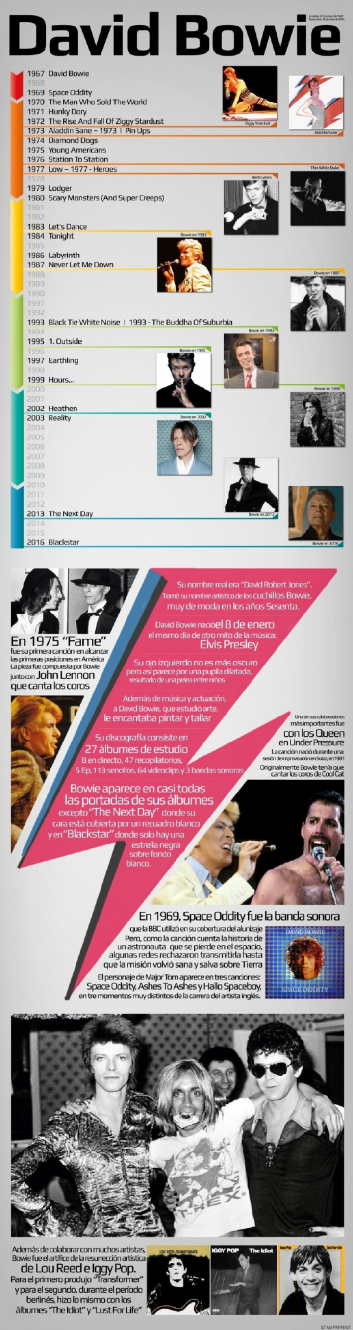 Esos y otros datos se recogen en la infografía de la web stampaprint.net en la que además se recuerda que Bowie salía en prácticamente todas las portadas de sus discos.