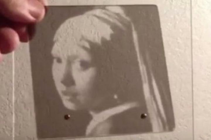 El vídeo comienza mostrándonos una placa de cristal sobre la que se coloca una lámina de cristal con la imagen en blanco y negro del famoso cuadro de Vermeer. Sobre esa base añade posteriormente otra lámina con el cuadro en amarillo, otra en magenta y la última, en cian.