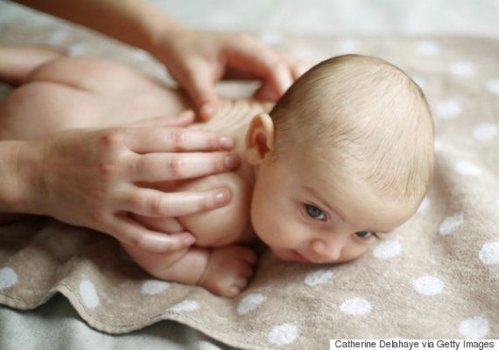 El Sistema de Salud Británico recomienda desnudar al bebé y darle un masaje con delicadeza. Masajea la espalda "con firmeza y a buen ritmo". ¿Cuál es la mejor posición para colocar al bebé? De pie frente a ti o boca abajo en tu regazo.
