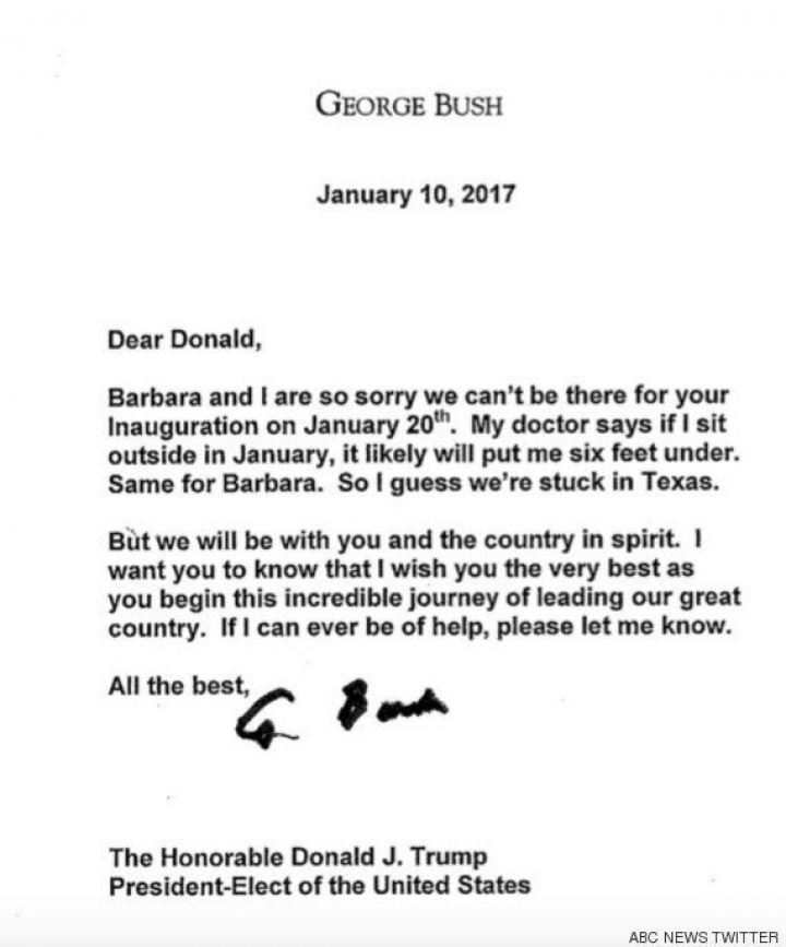 Bush se cae de la ceremonia y ha querido informar personalmente de la baja a la oficina de Trump a través de una carta que destila sentido del humor, algo por lo que el exmandatario norteamericano es bien conocido, aficionado como es a dejar perlas para el recuerdo en su correspondencia más amable.