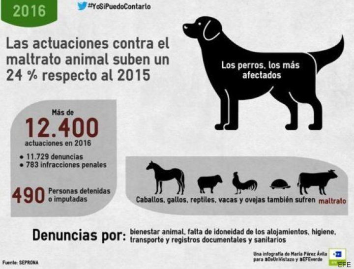 Más conciencia y mejores leyes acaban por dar resultado. El Servicio de Protección de la Naturaleza (Seprona) de la Guardia Civil acaba de informar de que el año pasado realizó más de 12.400 actuaciones contra el maltrato animal como consecuencia de 783 infracciones penales que supusieron la detención o investigación de 490 personas, además de 11.729 infracciones administrativas. Las actuaciones han subido un 24 % respecto a 2015.