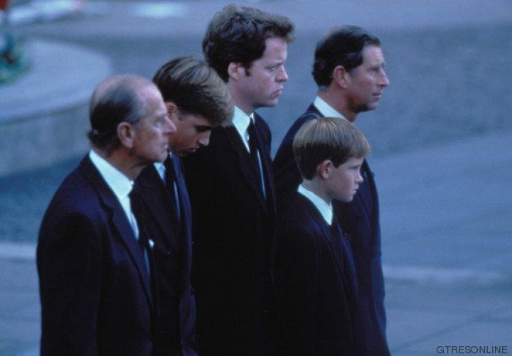 Los príncipes Guillermo y Enrique junto a su padre, su abuelo y su tío en el funeral de Diana de Gales.