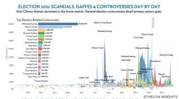 Echelon Insights llevó a cabo una investigación sobre las polémicas relacionadas con las elecciones que han surgido en 2016. Han llegado a la conclusión de que la retórica anti Clinton dominó el panorama político durante los últimos días de campaña. La cobertura mediática negativa del tema de Wikileaks y de los correos de Clinton consiguió más de 50 millones de menciones en las redes sociales. En comparación, las grabaciones de Trump publicadas por Access Hollywood sólo se mencionaron 5 millones de veces. ¿Es posible que 50 millones de menciones negativas hayan otorgado 80.000 votos a Trump?
