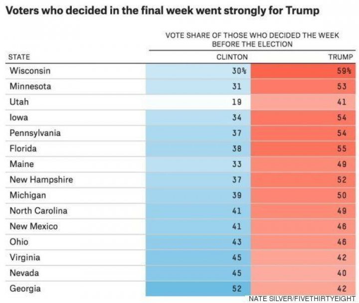 "Comey ha tenido un gran impacto cuantificable en las elecciones", afirma Nate Silver, redactor jefe de FiveThirtyEight. "Los votantes que se decidieron a última hora se mostraron en contra de Clinton en los estados pendulares y por eso perdió en Wisconsin, en Míchigan y en Pensilvania".