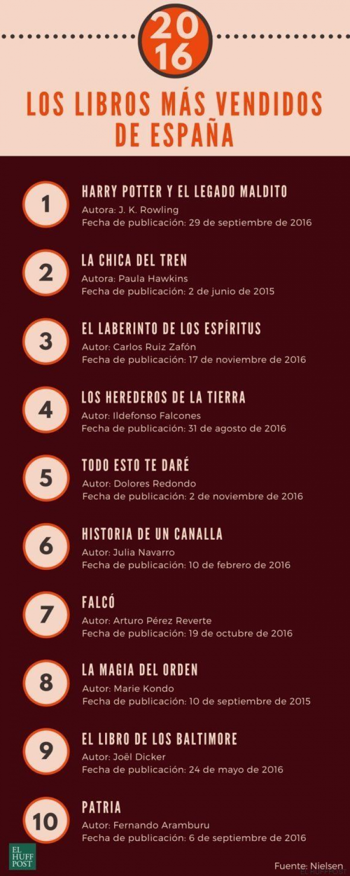 En cambio, también resulta llamativo que, de los libros publicados en 2016, varios de ellos se hayan situado tan arriba en las listas de ventas cuando han llegado a las librerías bastante tarde, incluso avanzado el otoño: Harry Potter salió el 29 de septiembre, El laberinto de los espíritus el 17 de noviembre, o Todo esto te daré, ganadora del Planeta, el 2 de noviembre.