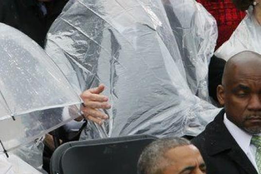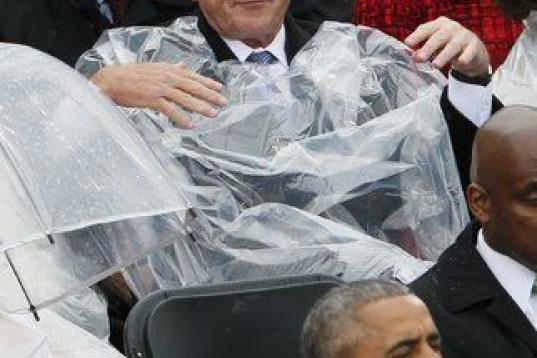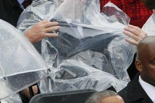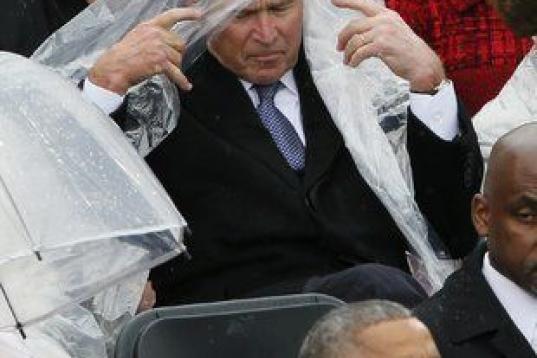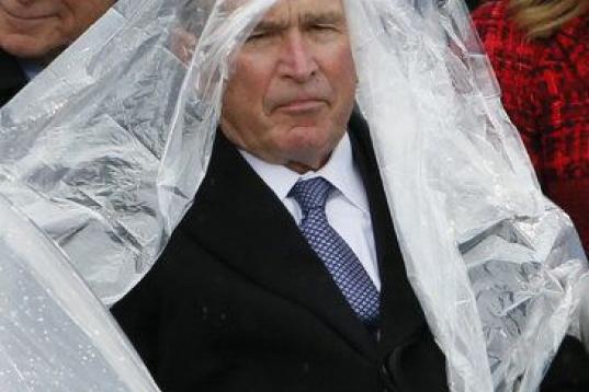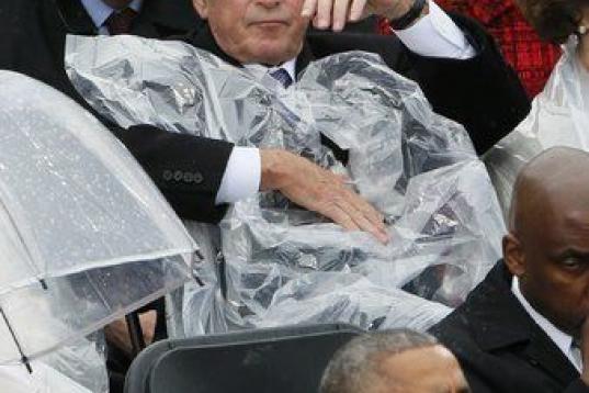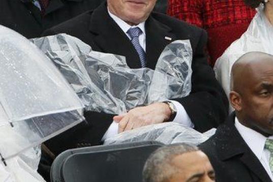 En un momento del acto comenzó a llover y Bush trató de protegerse del agua colocándose un plástico. Pero no contaba con los problemas que iba a tener para ponerse finalmente la protección. Lo puedes comprobar en la galería de fotos más abajo.