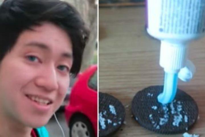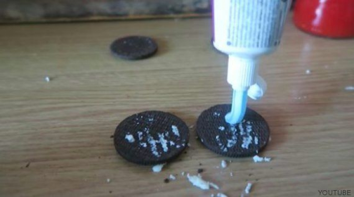 Así, se pone manos a la obra: en las imágenes se ve claramente cómo vacía la crema del centro de las galletas para volver a echarles la pasta de dientes y luego juntar de nuevo las dos partes.