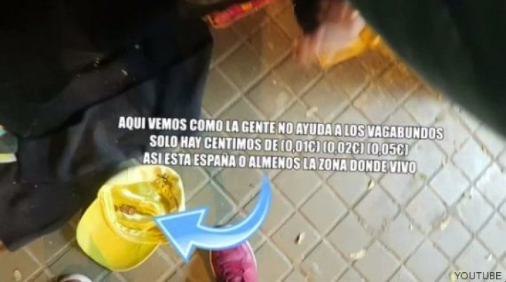 Entonces, le da otro billete al hombre, y para que quede claro su enorme labor humanitaria, deja claro con otro cartelito que él sí que ayuda a los demás. "Aquí vemos cómo la gente no ayuda a los vagabundos. Solo hay céntimos de (0,01€) (0,02€) (0,05€) Así está España o almenos (sic) la zona donde vivo".