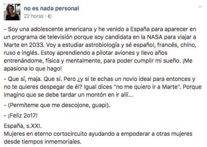 En su post, lamenta que hay "mujeres en eterno cortocircuito ayudando a empoderar a otras mujeres desde tiempos inmemoriales". Y hace una parodia de la conversación que Pedroche tuvo con Carson que acumula más de 1.700 compartidos y 3.400 reacciones.