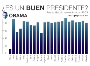No es España quien encabeza la buena valoración de Obama, aunque el 80% de los españoles piensa que fue buena. En esta ocasión, es Corea del Sur (con un 92% de opinión positiva), seguida de India (con el 89%), quienes hacen mejor valoración de los mandatos del presidente saliente.