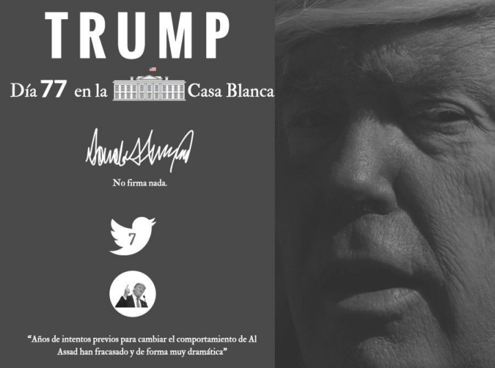 Como él mismo se encarga de proclamar a los cuatro vientos (véanse las mayúsculas empleadas en su tuit), por vez primera Trump alcanza el 50% de popularidad en una de las encuestas (Rasmussen Reports). Pasa tras medidas en Siria, Afganistán y Corea del Norte.