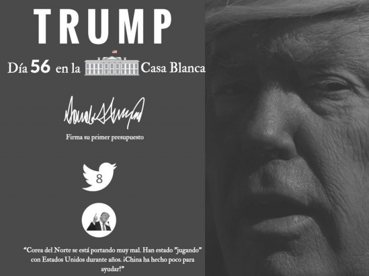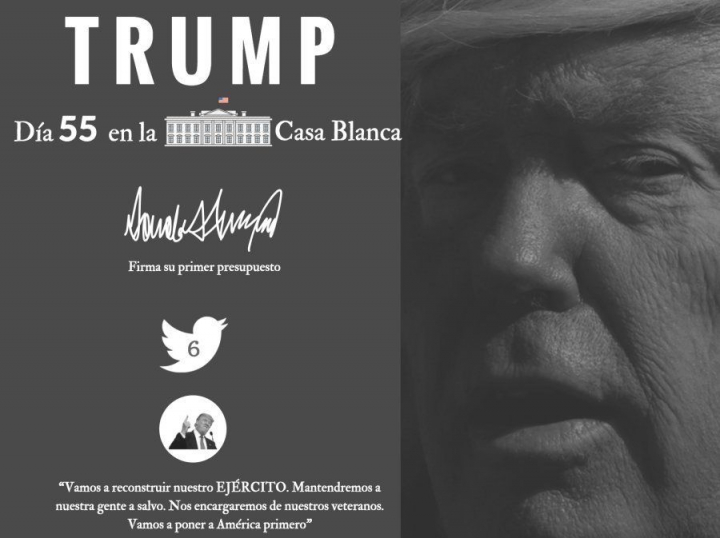 Trump presenta su primer presupuesto que es, por otro lado, toda una declaración de intereses. Según este plan económico, el departamento de Defensa recibirá un incremento de 10% en sus partidas presupuestarias y el de Seguridad Nacional de 6.8%; se reservan 1,500 millones de dólares para empezar la construcción del muro fronterizo con México. Los grandes castigados son la Agencia de Protección Ambiental, con 31% menos de recursos, y el Departamento de Estado, con un recorte de 28%.