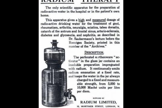 Un anuncio que promocionaba la preparación de agua potable en casa fue una de las muchas promociones de la terapia de radio en el año 1913. Hoy en día el peligro que representa el radio para la salud es ampliamente conocido.