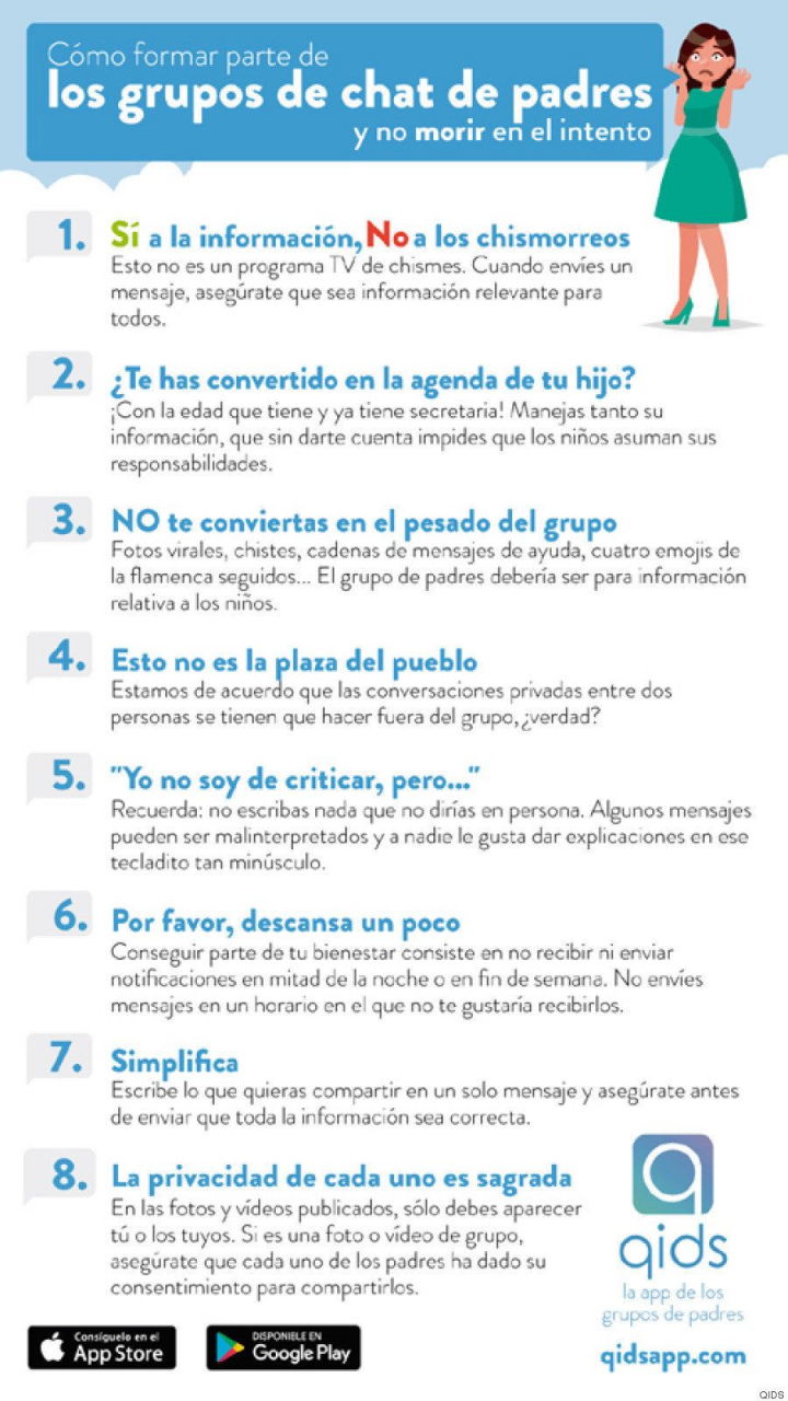 Ahora la app de grupos para padres qids da una serie de consejos útiles para quienes se enfrenten a esos multitudinarias plazas de pueblo en las que se han convertido los chats. Las claves: el respeto y la privacidad.
