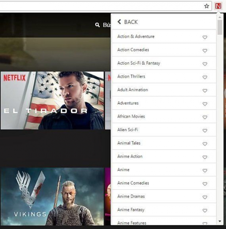Gracias a una extensión de Chrome que se llama Netflix Categories se puede acceder desde el navegador a una lista de subcategorías de Netflix. Sólo hay que instalar la extensión, hacer clic sobre el icono que aparecerá a la derecha de la barra de búsqueda y vagar por el desplegable hasta encontrar el género deseado.