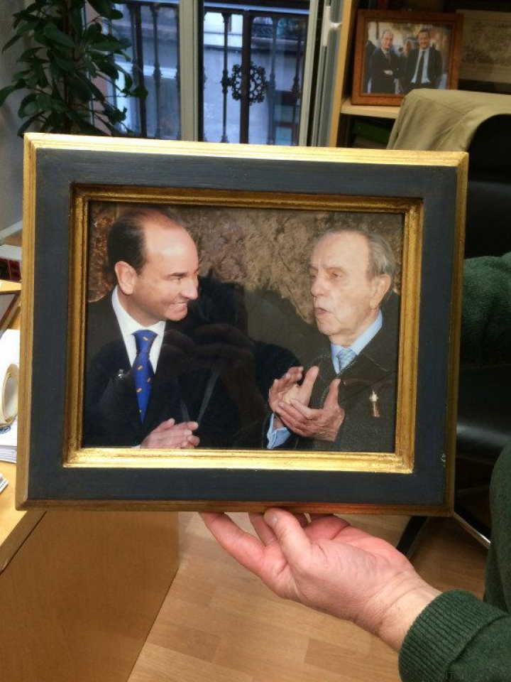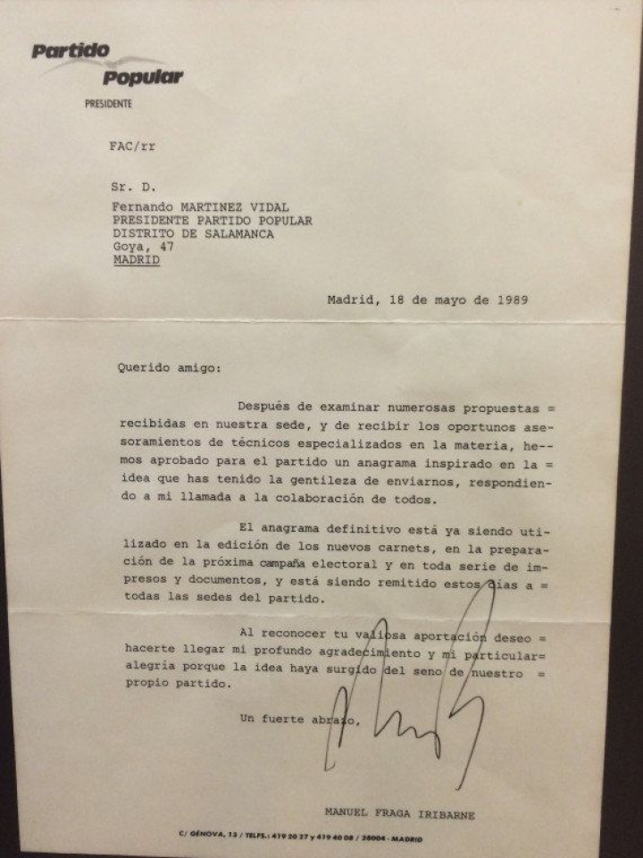 No cobró ni una peseta. Nunca pidió nada, era un trabajo que donaba a su formación política. Y se siente absolutamente pagado viendo por la calle las banderolas y los carteles con su creación. En su despacho exhibe con orgullo una carta enmarcada enviada por Fraga agradeciéndole la labor y reconociendo su autoría. Hoy es pieza clave en la decoración en su oficina municipal en la calle Mayor, junto a un cuadro pop con el rostro de Esperanza Aguirre, una placa de la plaza Margaret Thatcher, la bandera de España y fotografías junto a María San Gil e Íñigo Henríquez de Luna.
