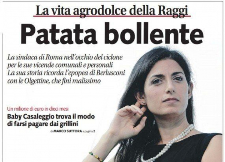 El diario conservador, dirigido por el periodista Vittorio Feltri, titula junto a una enorme foto de Raggi: "Patata Bollente" (Patata Caliente) con el objetivo de referirse a las dificultades de la alcaldesa, pero también haciendo uso del lenguaje vulgar que se refiere al órgano sexual femenino.