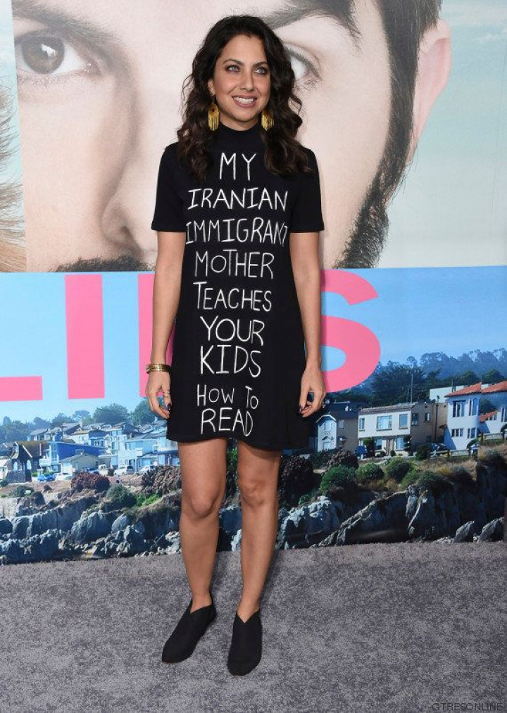 El diseño, un vestido negro corto, llevaba inscrito en letras blancas un poderoso mensaje: "Mi madre, inmigrante iraní, enseña a tus hijos a leer".