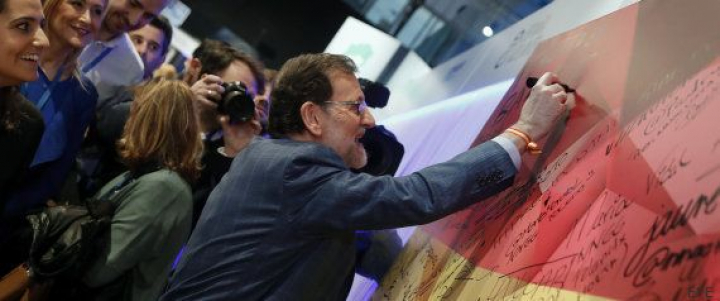Eso para dentro. De cara a las cámaras, todo son pantallas gigantes, banderas de España virtuales que se mueven al ritmo de las nubes y selfies. Y es que el presidente del Gobierno no puede andar ni medio paso sin que le pidan una foto. Los compromisarios quieren colgar en Twitter y presumir en sus provincias de sus instantáneas con el hombre que más manda en España.