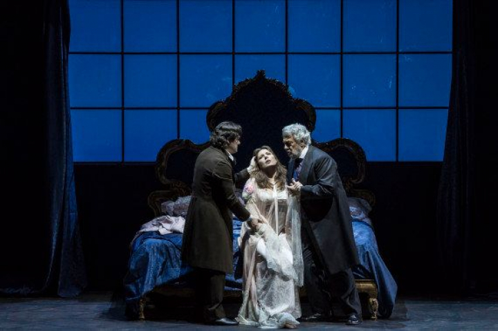La soprano letona Marina Rebeka abundó en la paradoja de una voz portentosa que, por momentos, no fue capaz de transmitir la intensidad de los sentimientos de la protagonista, especialmente en el Amami, Alfredo. Lo que no impidió que fuera agasajada por el público. El tenor mexicano Arturo Chacón-Cruz cumplió, no sin dificultades, en el rol de Alfredo. Mención aparte merece la interpretación de Plácido Domingo, que debutó en 1959 como tenor en el papel de Alfredo y se enfrentó, a sus 76 años y por primera vez en España, a la parte de barítono encarnando al padre del protagonista. Su interpretación de la gran aria del II acto, Di Provenza il mar, il suol, arrancó varios bravos a la grada.