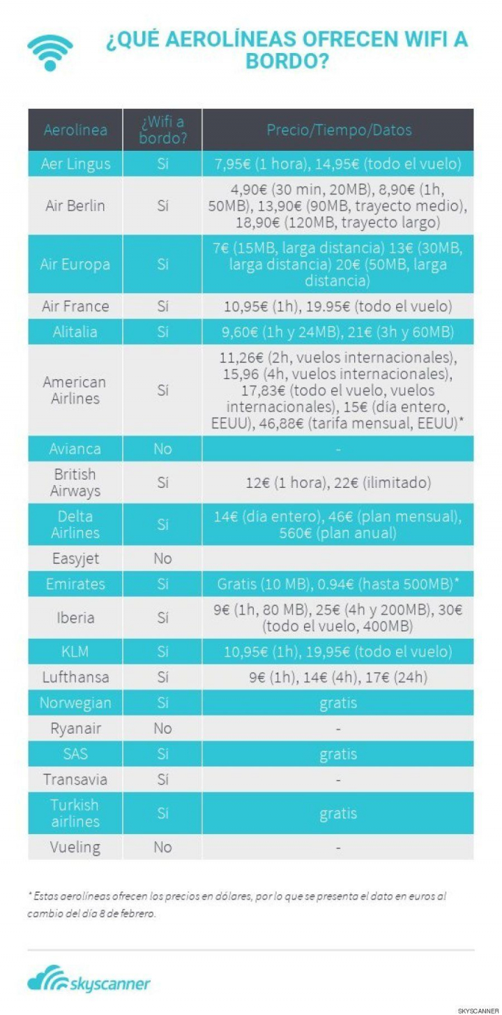 Existen otras 13 compañías que ofrecen el servicio de pago —suelen ser 10 euros por hora— y otras tres compañías —Vueling, Ryanair y Easyjet— que no lo tienen en su menú.