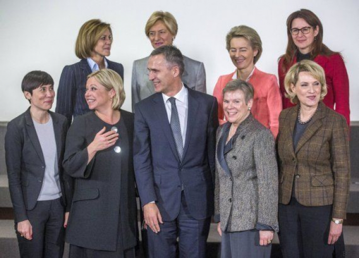 En la imagen aparecen, de izquierda a derecha, la ministra noruega de Defensa, Ine Marie Eriksen Soreide, la ministra holandesa de Defensa, Jeanine Hennis-Plasschaert, el secretario general de la OTAN, Jens Stoltenberg, la vicesecretaria general de la OTAN, Rose Gottemoeller, la ministra albanesa de Defensa, Mimi Kodheli, (arriba) la ministra española de Defensa, María Dolores de Cospedal, la ministra italiana de Defensa, Roberta Pinotti, la ministra alemana de Defensa, Ursula von der Leyen, y la ministra eslovaca de Defensa, Andreja Katic.