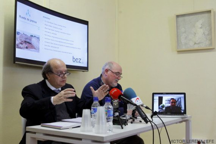 El investigador principal, Miguel Caballero (derecha), junto al arqueólogo director Javier Navarro Chueca, explicando sus conclusiones.