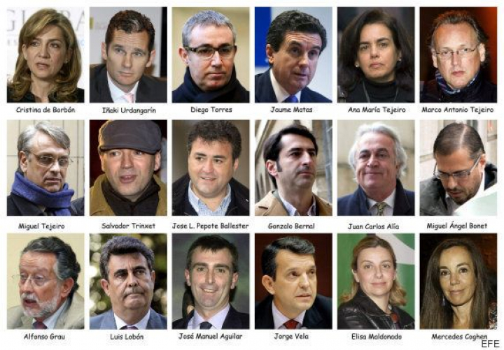 El resto de acusados son Ana Mª Tejeiro, esposa de Torres; su hermano, Marco Antonio Tejeiro, contable del Instituto Nóos; el asesor fiscal Salvador Trinxet; el exdirector general de Deportes de Baleares José Luis Ballester; el exdirector de la fundación Illesport Gonzalo Bernal; el exdirector y el secretario del Instituto Balear de Turismo, Juan Carlos Alía y Miguel Ángel Bonet.