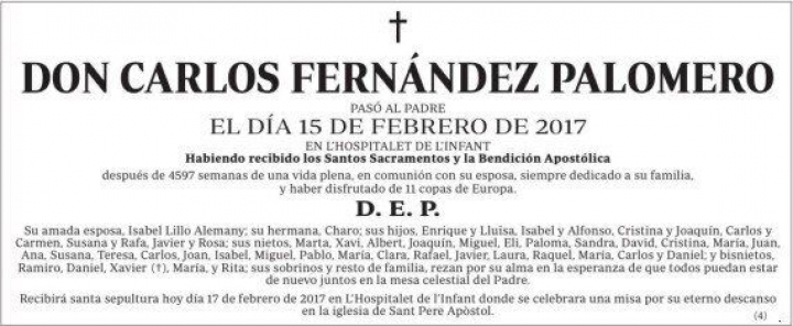 Don Carlos Fernández Palomero, de L'Hospitalet de L'Infant (Tarragona), dejó una emotiva esquela que rezaba así: "Habiendo recibido los Santos Sacramentos y la Bendición Apostólica después de 4597 semanas de una vida plena, en comunión con su esposa, siempre dedicado a su familia y haber disfrutado de 11 copas de Europa".