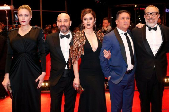 La productora Carolina Bang, los actores españoles Jaime Ordóñez, Blanca Suárez y Secun de la Rosa y el director Álex de la Iglesia a su llegada a la presentación de 'El Bar' en la Berlinale.