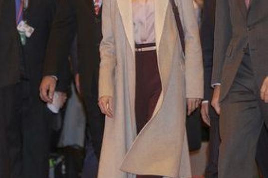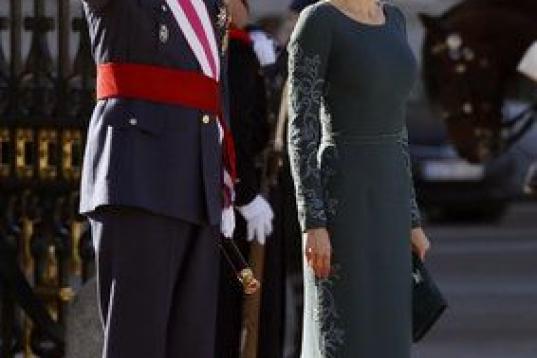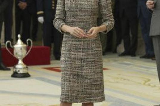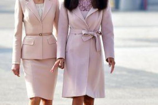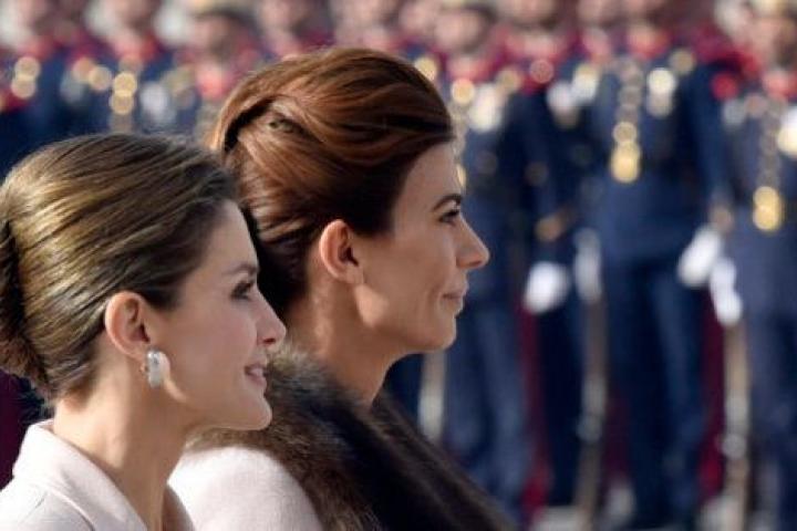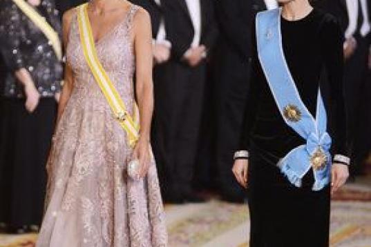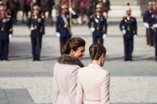 La nota de color (literal y figuradamente) la han puesto ellas, las esposas de Macri y del rey Felipe VI. Y lo han hecho por la absoluta similitud de sus atuendos. La coincidencia no ha sido una, sino muchas. Bajo el soleado cielo de Madrid, en el despejado patio del Palacio Real, han desfilado las dos, Awada con un abrigo atado y la reina Letizia con un traje de chaqueta con cinturón y falda lápiz de Felipe Varela (que estrenó en 2013 y ha lucido en media docena de ocasiones) cuyo corte era corte prácticamente igual. Iguales eran también los largos de las faldas y las mangas, y sus escotes en pico y con camisas lenceras debajo… y, para más inri, los colores. Ambas han optado por un tono beis rosado, el de Letizia en un tono más palo y el de Awada ligera, ligerísimamente más lila.