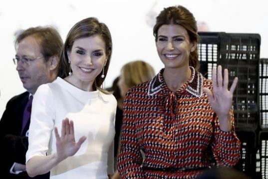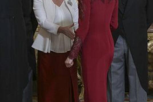 La reina, con Juliana Awada (esposa del presidente Mauricio Macri) en la recepción de bienvenida ofrecida en el Palacio Real