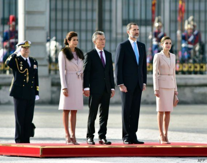 Parece que el protocolo no ha afectado a los caballeros: correctos con sus trajes de chaqueta oscuros y sus zapatos ídem (Macri de cordones y Felipe VI de hebillas), ambos han optado por camisa blanca, pero Macri con una corbata morada y el rey en azul claro con motas blancas, quizá un guiño a la bandera argentina.