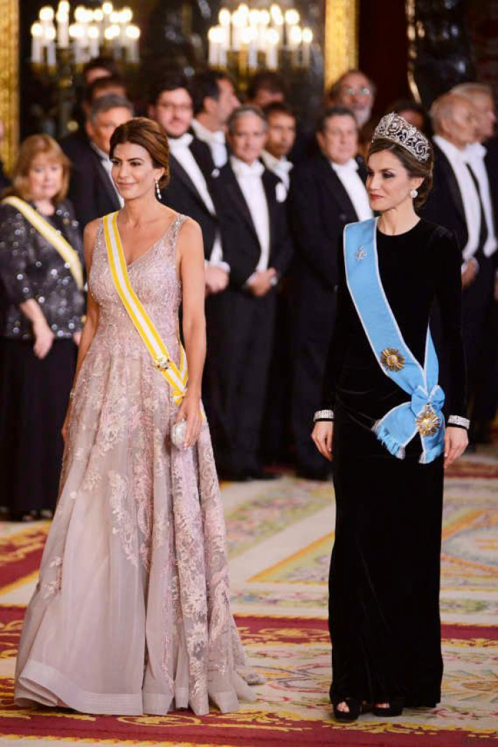 Mientras que por la mañana destacó la coincidencia en cómo iban vestidas la esposa de Macri y la consorte de Felipe VI, por la noche sus atuendos han sido bien diferentes. Juliana Awada optó por un vestido de tirantes en color rosa con incrustaciones de cristales de Swarovski de la firma Atelier Gabriel, mientras que la reina lució un vestido negro de terciopelo y manga larga de su modisto de cabecera, Felipe Varela, con banda azul celeste. Un marco perfecto para adornarlo con brillantes.