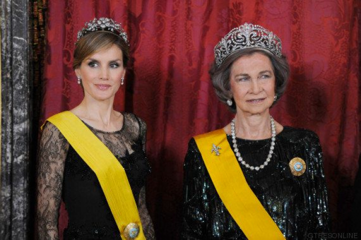 La última vez que se pudo ver la célebre tiara fue precisamente en la despedida del rey Juan Carlos. La reina Sofía la lució en la cena de gala que supuso el relevo de su marido a su hijo en el trono, el 19 de junio de 2014.