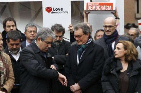 Mas y miembros del Govern apoyan a Homs con una urna de cartón gigante ante su juicio en el TS