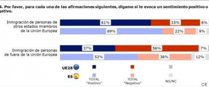 Además, según el Eurobarómetro, el 52 % de los españoles son favorables a la migración de fuera de la UE y el 36% en contra.