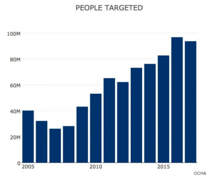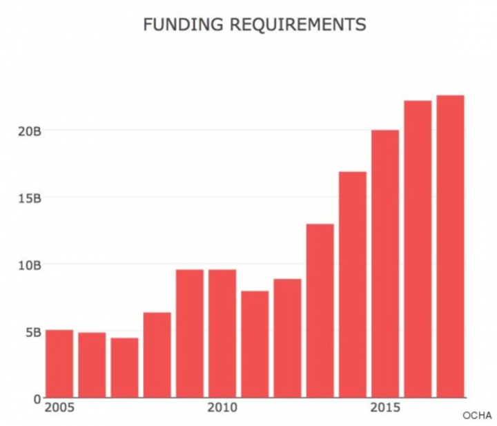 La Oficina de Naciones Unidas para la Coordinación de Asuntos Humanitarios (OCHA) necesita este dinero para ayudar a 93,5 millones de personas en 33 países. Son unos 2.000 millones más respecto a lo ya solicitado en 2016, porque se ha detectado un "enorme cambio en la frecuencia, escala y magnitud de las emergencias", señala este organismo. No hay más que comparar: en los seis primeros llamamientos de este tipo hechos por la ONU, desde 1992, la cifra que se pedía era de 2.700 millones de dólares (unos 2.500 millones de euros).