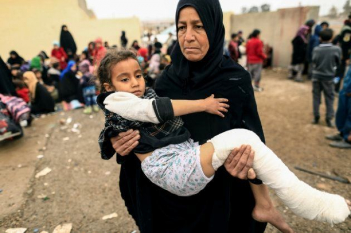 Una mujer huye con su hija herida en el oeste de Mosul, asediada por los choques entre la coalición internacional y el ISIS.