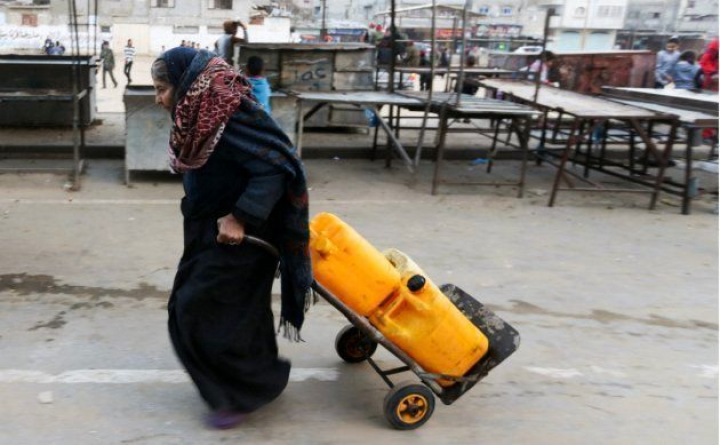 Una anciana carga bidones de agua tras llenarlos en un grifo público, al sur de Gaza.
