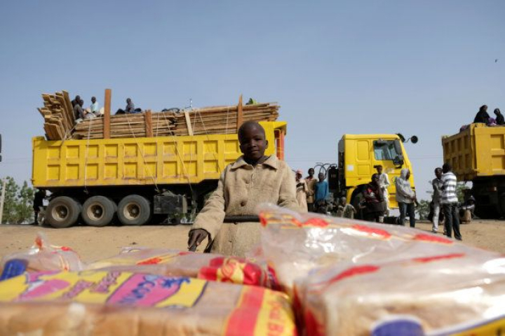 Un niño refugiado vende pan junto a camiones cargados de material de construcción en Maiduguri, Nigeria.