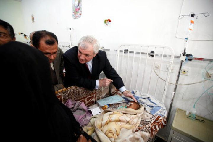 Stephen O'Brien, responsable de la OCHA, visitando a niños desnutridos en un hospital de la capital yemení, el pasado 2 de marzo.